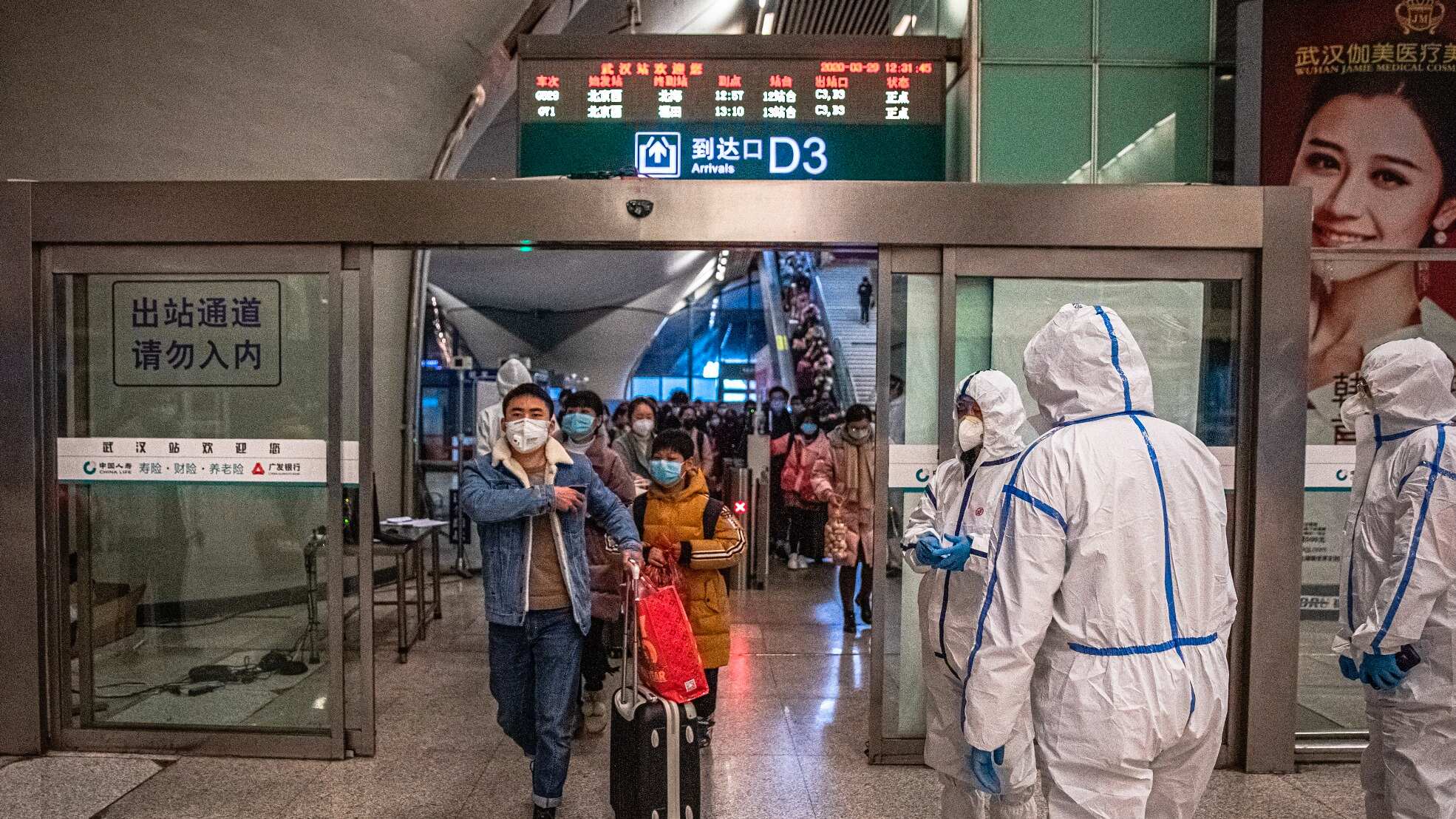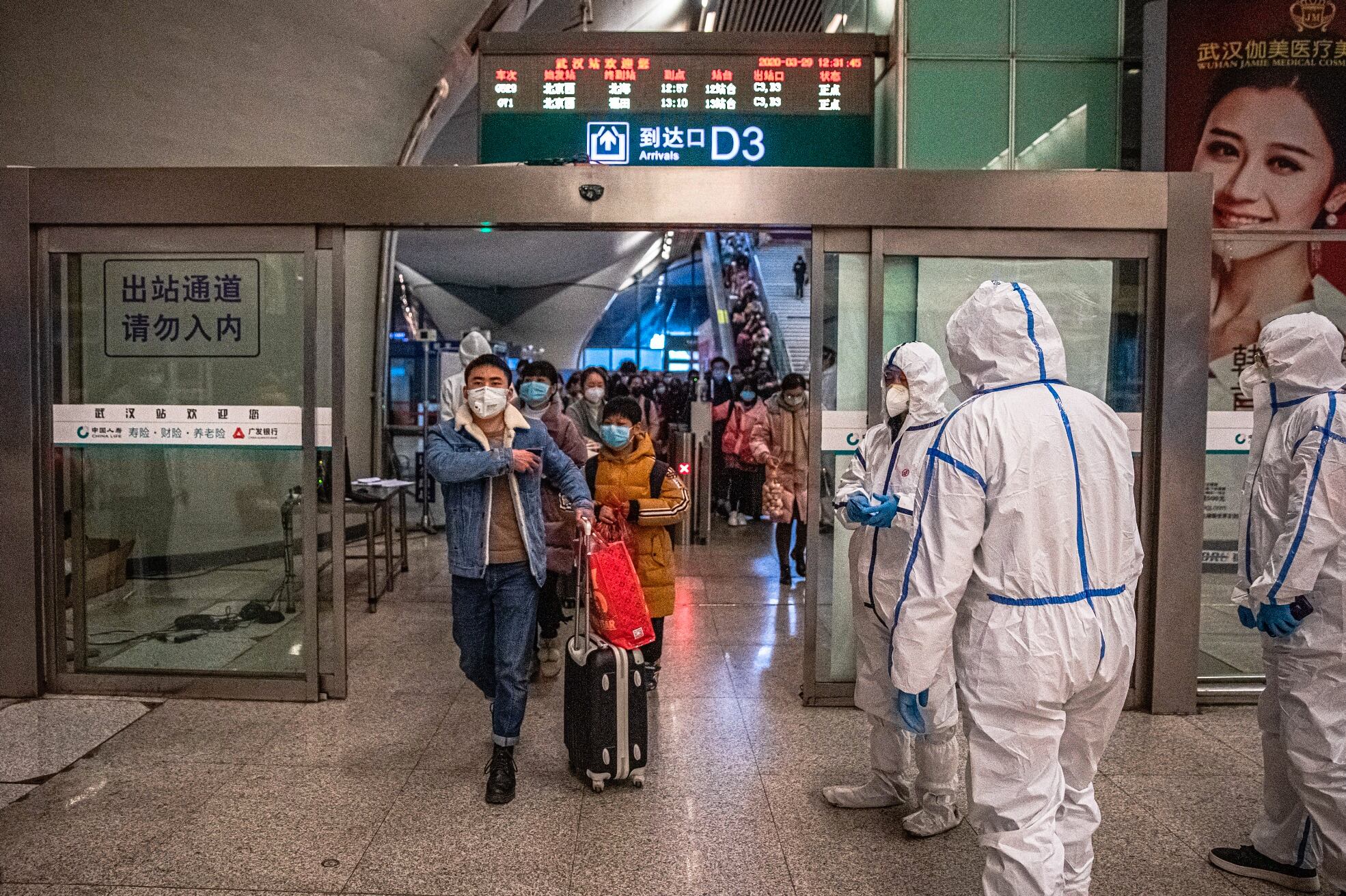 A la llegada, en la estación de Wuhan, esperan varios hombres enfundados en trajes blancos de protección para continuar haciendo preguntas: procedencia, residencia, motivos del viaje.
