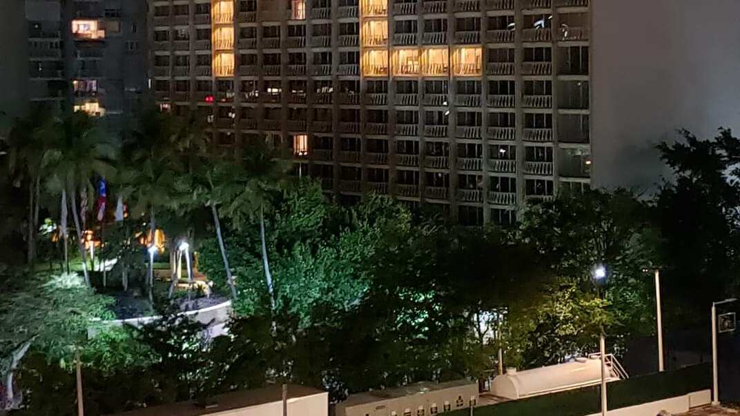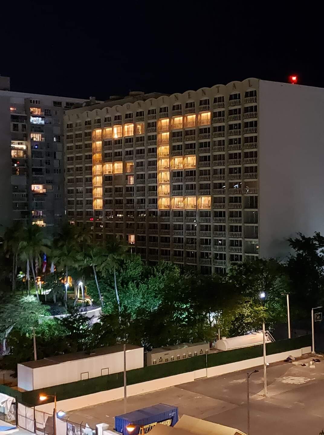 El hotel Intercontinental en Isla Verde iluminó hoy varias habitaciones para trazar un mensaje de aliento dentro de la situación actual: “Fe”.