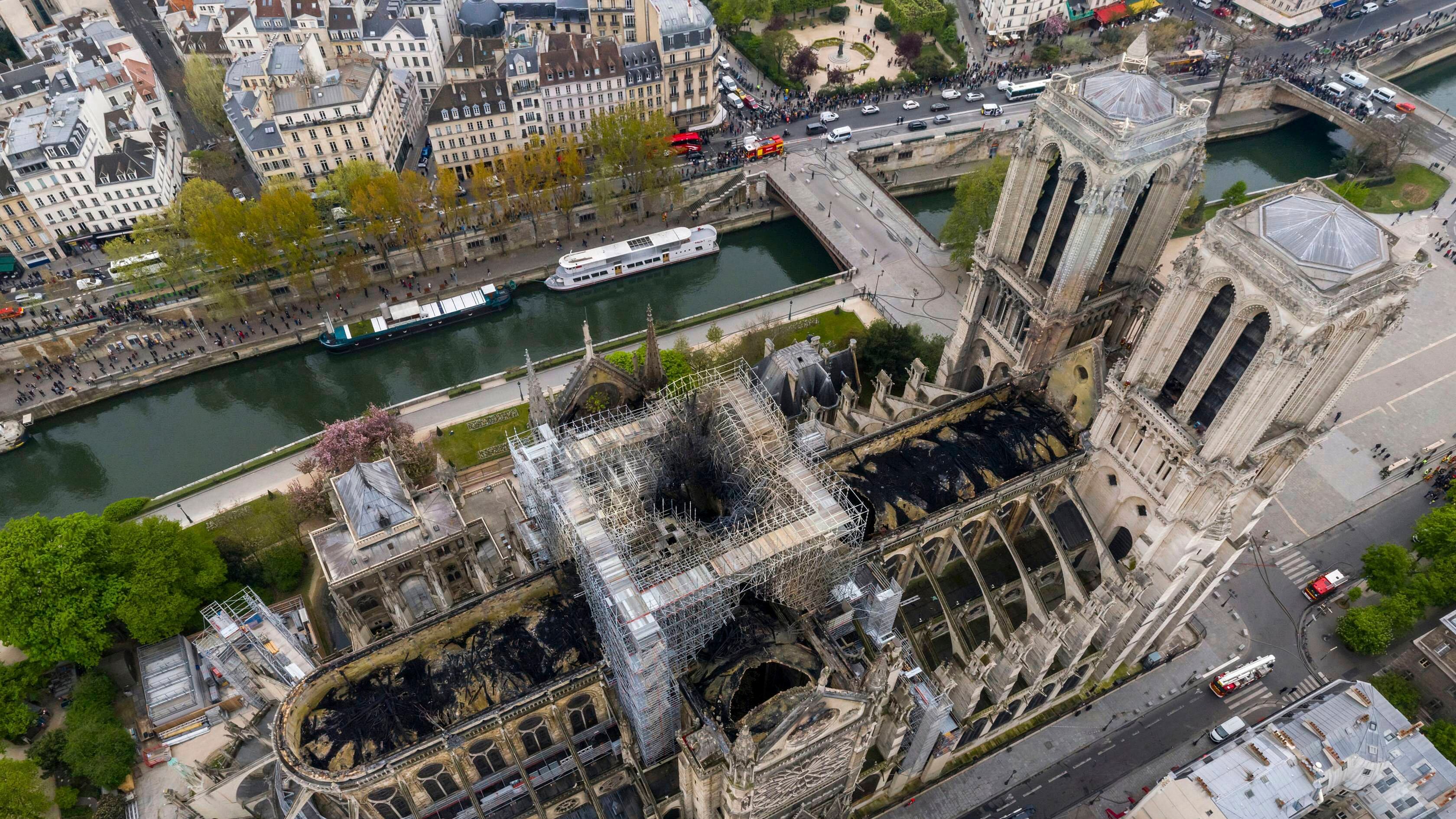 El arzobispo Michel Aupetit y tres clérigos que lo acompañaron usaron cascos al entrar a la dañada catedral que está cerrada al público y que él describió como “medio colapsada”. Luego se quitaron los cascos para la ceremonia, frente a una gran cruz y bajo el enorme hoyo en el techo de la catedral.