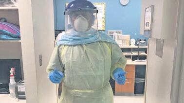 Antes de entrar al cuarto, el médico se coloca varias capas de protección entre los scrubs, batas, guantes, mascarillas, una careta, un forro para los zapatos y unos pads para cubrir la piel que quedó al descubierto entre los zapatos y el ruedo de la bata.