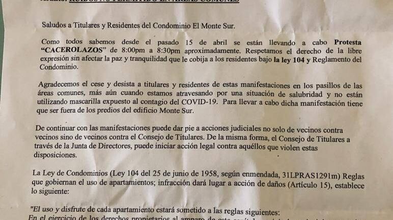 El condominio Monte Sur, en Hato Rey, envió una carta a sus titulares y residentes para exigirles que cesen de realizar las manifestaciones denominadas cacerolazos que se efectúan diariamente, convocadas para reclamar la realización de más pruebas ante la emergencia del COVID-19.