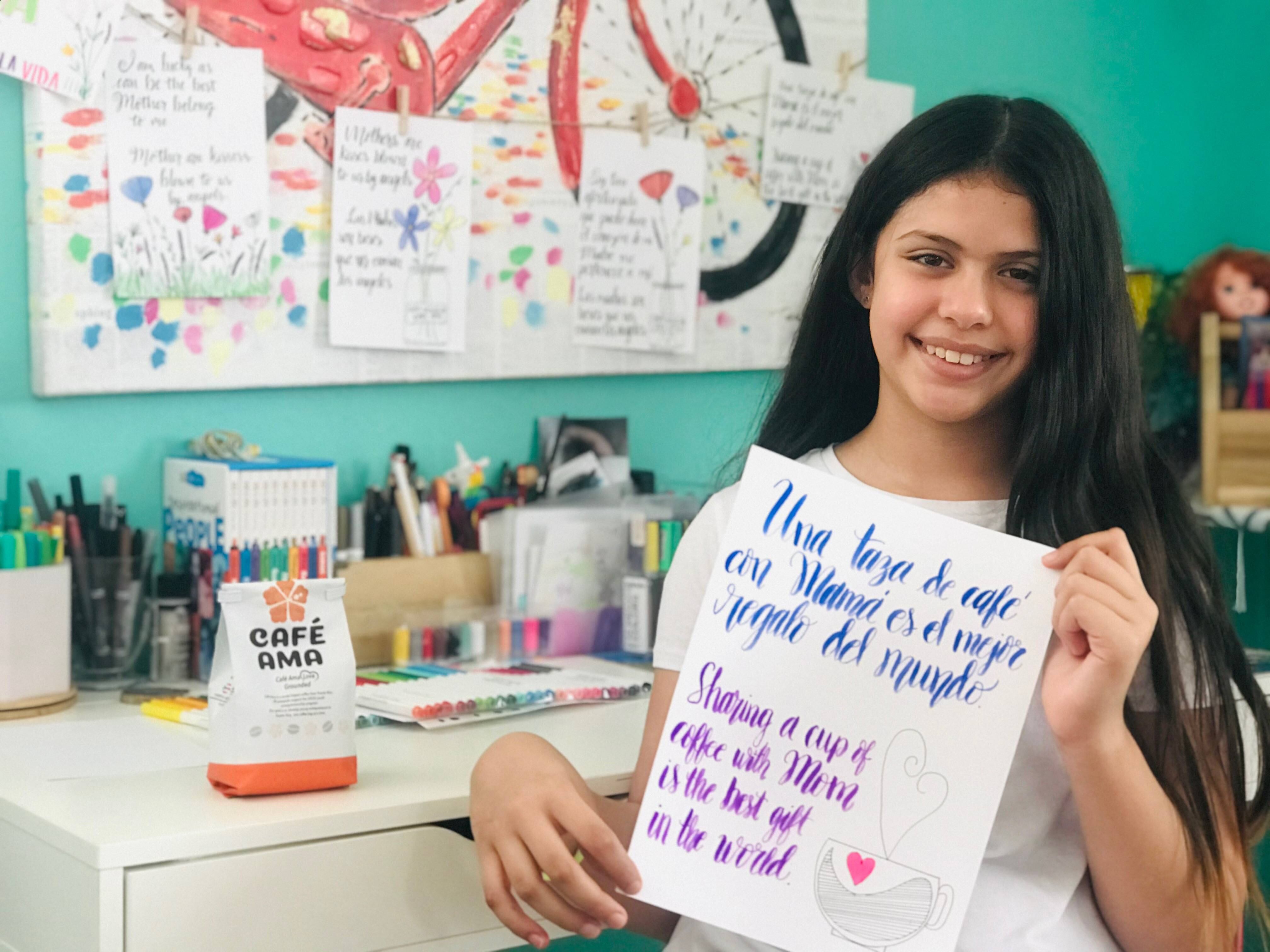 La tarjeta creada por Mia lee como sigue: “Soy tan afortunada que el corazón de mi madre me pertenece a mí. Las madres son besos que nos envían los ángeles”. La tarjeta será acompañada por una bolsa de Café Ama y servirá para recaudar fondos para los programas de emprendimiento de SEEDS.