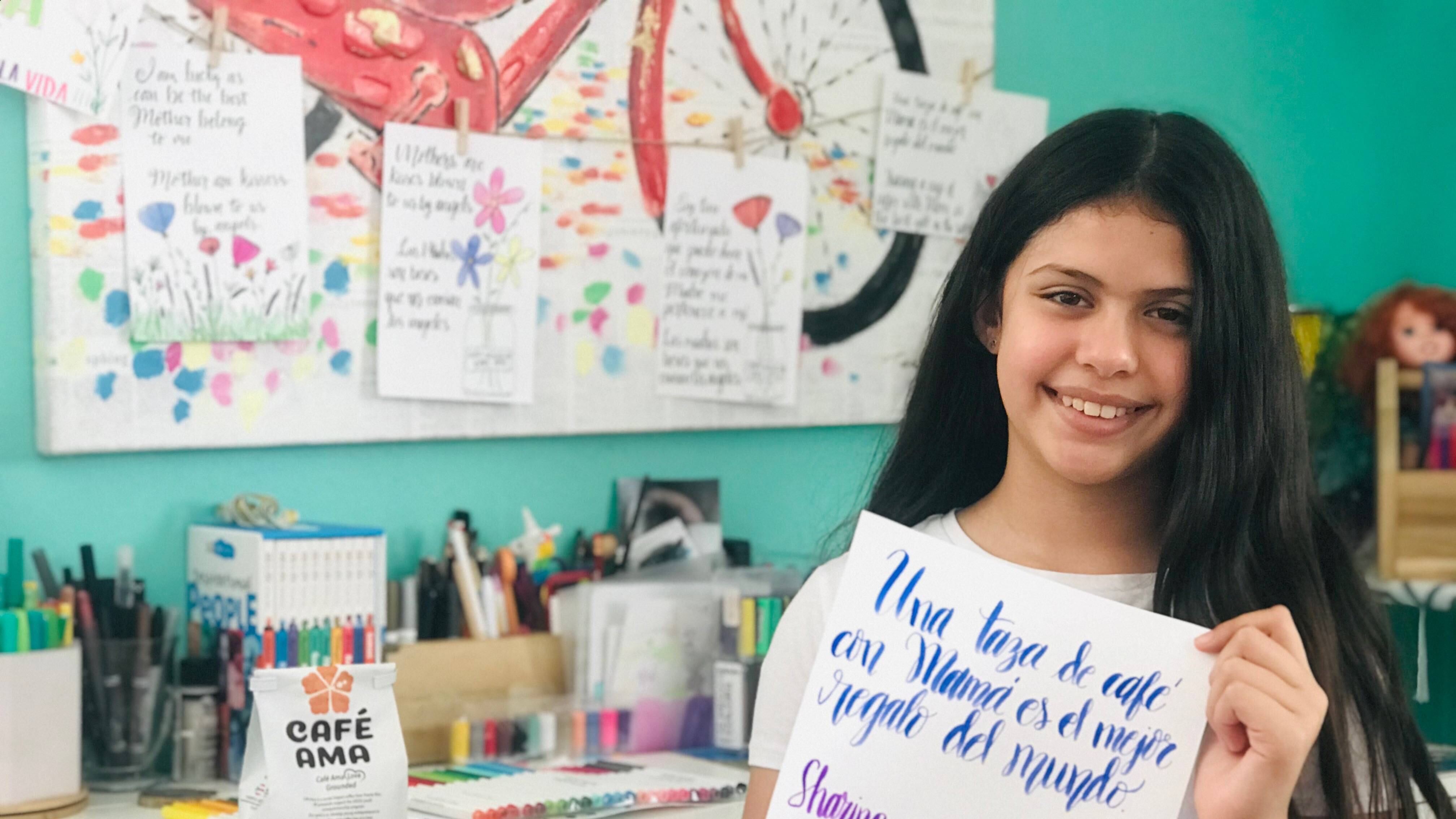 “Esa es mi empresa personal que se llama Toques de Amor. Son unas tarjetas hechas a mano en lettering que es un arte de dibujar letras en tarjetas”, mencionó Mia, quien participa del programa SEEDS en su escuela Montesorri en Aibonito.