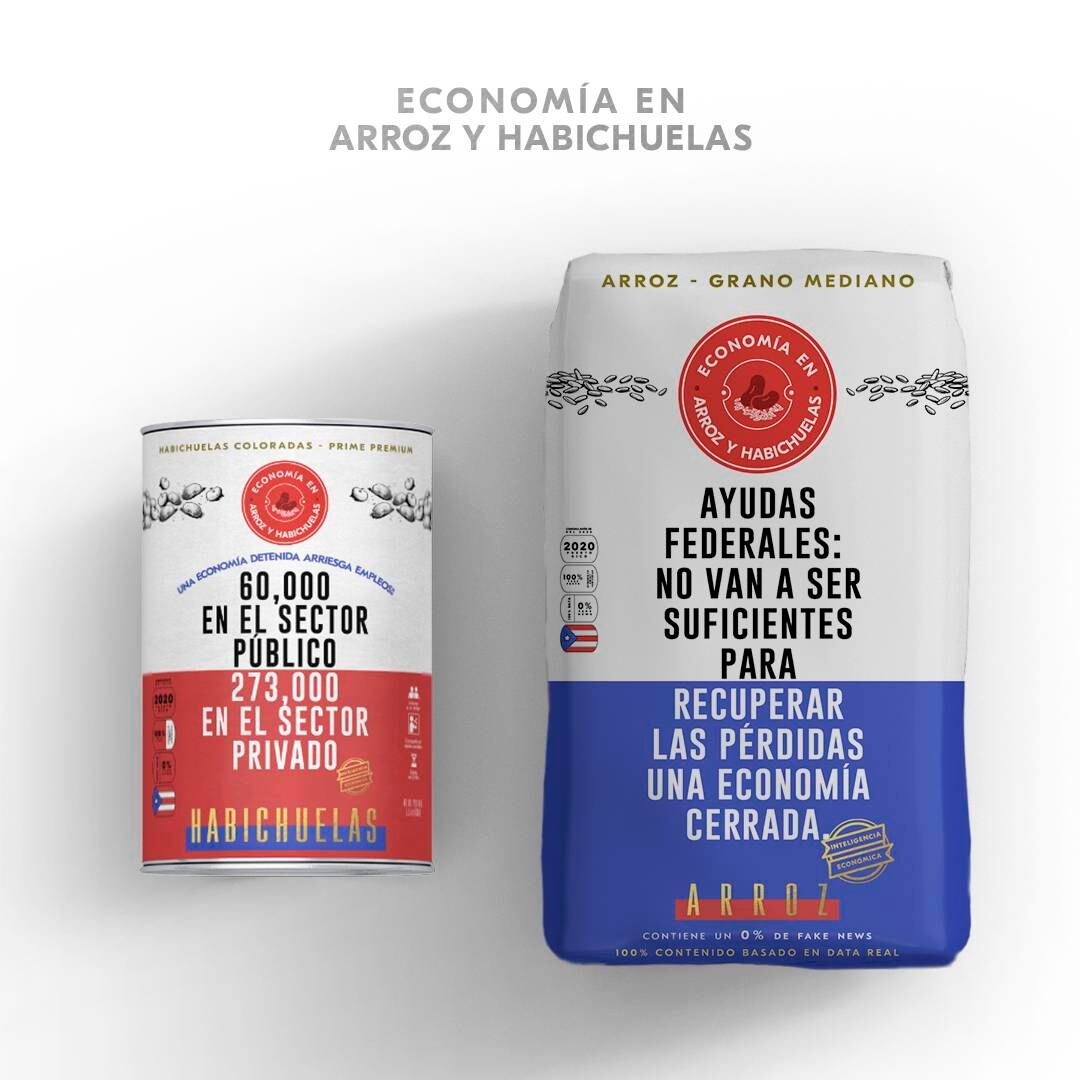 La iniciativa presenta los mensajes junto a visuales gráficos y fáciles de entender plasmados sobre la imagen de un paquete de arroz y una lata de habichuelas. Enfatiza que la información contiene 0% de “fake news” y 100% contenido basado en data real suministrada por Inteligencia Económica, Inc.