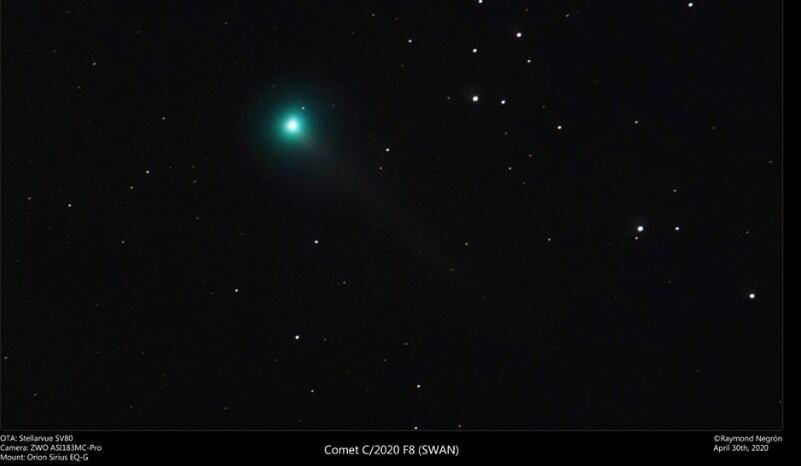 Así lo informó la Sociedad de Astronomía del Caribe (SAC), al indicar se trata del cometa C/2020 F8 (Swan), descubierto por el astrónomo aficionado Michael Mattiazzo, de Australia. El entusiasta del cielo detectó el cometa mientras revisaba imágenes captadas por el instrumento óptico Swan de la nave “Solar Heliospheric Observer” (SOHO).
