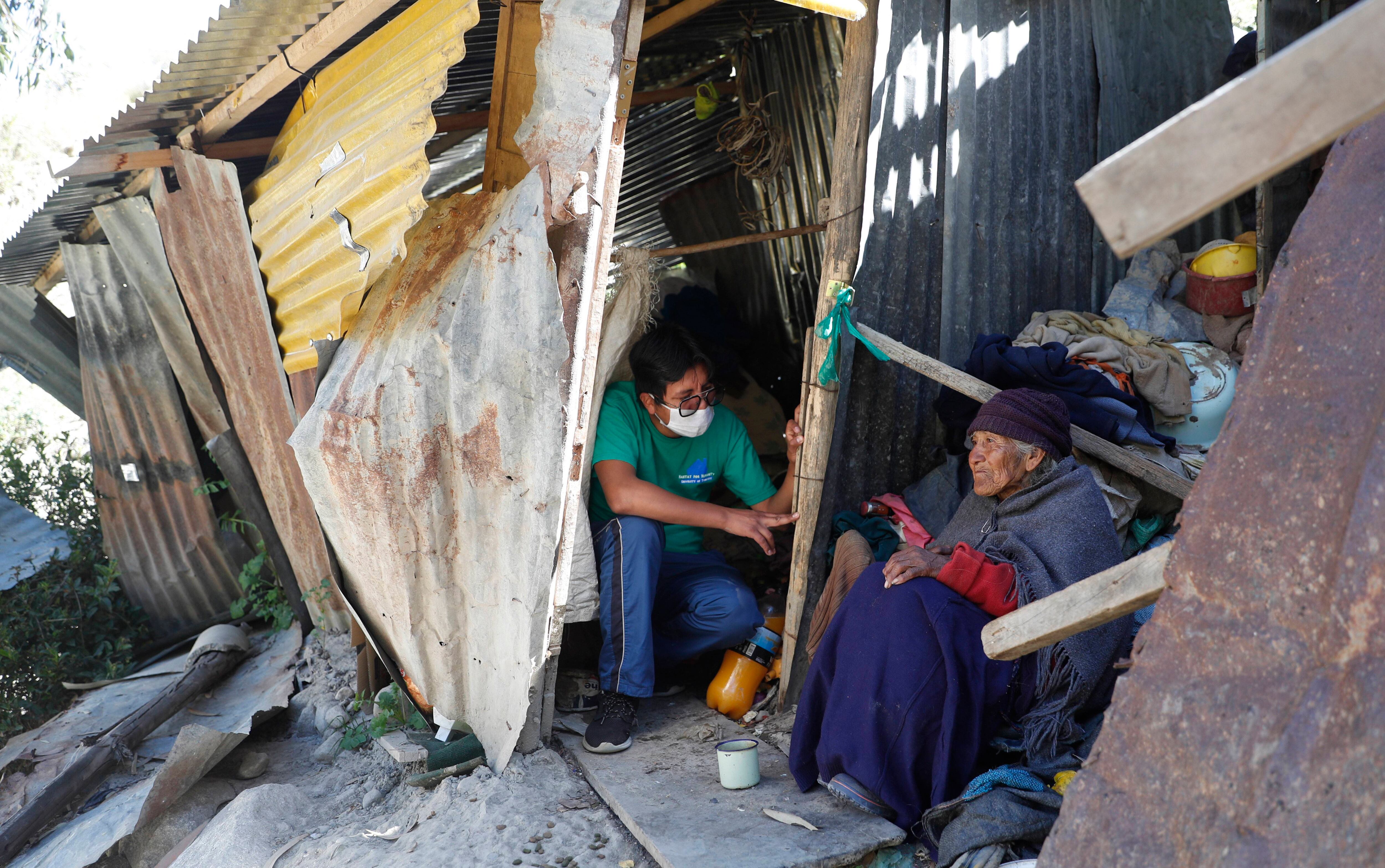 Oscar Gemio, de 97 años, e Inés Urrelo, de 62, son apoyados con alimentos y unas palabras de ánimo por parte de Royuela, quien les pide seguir las normas de seguridad para evitar los contagios, pero ellos prefieren no usar mascarillas de protección.