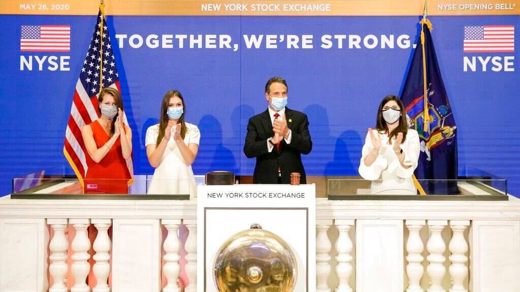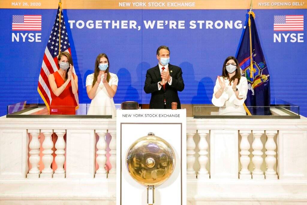 La sede de la Bolsa de Valores de Nueva York reabrió el martes por primera vez en dos meses con una erupción de aplausos y júbilo cuando el gobernador Andrew Cuomo tocó la campana de inicio de la jornada.