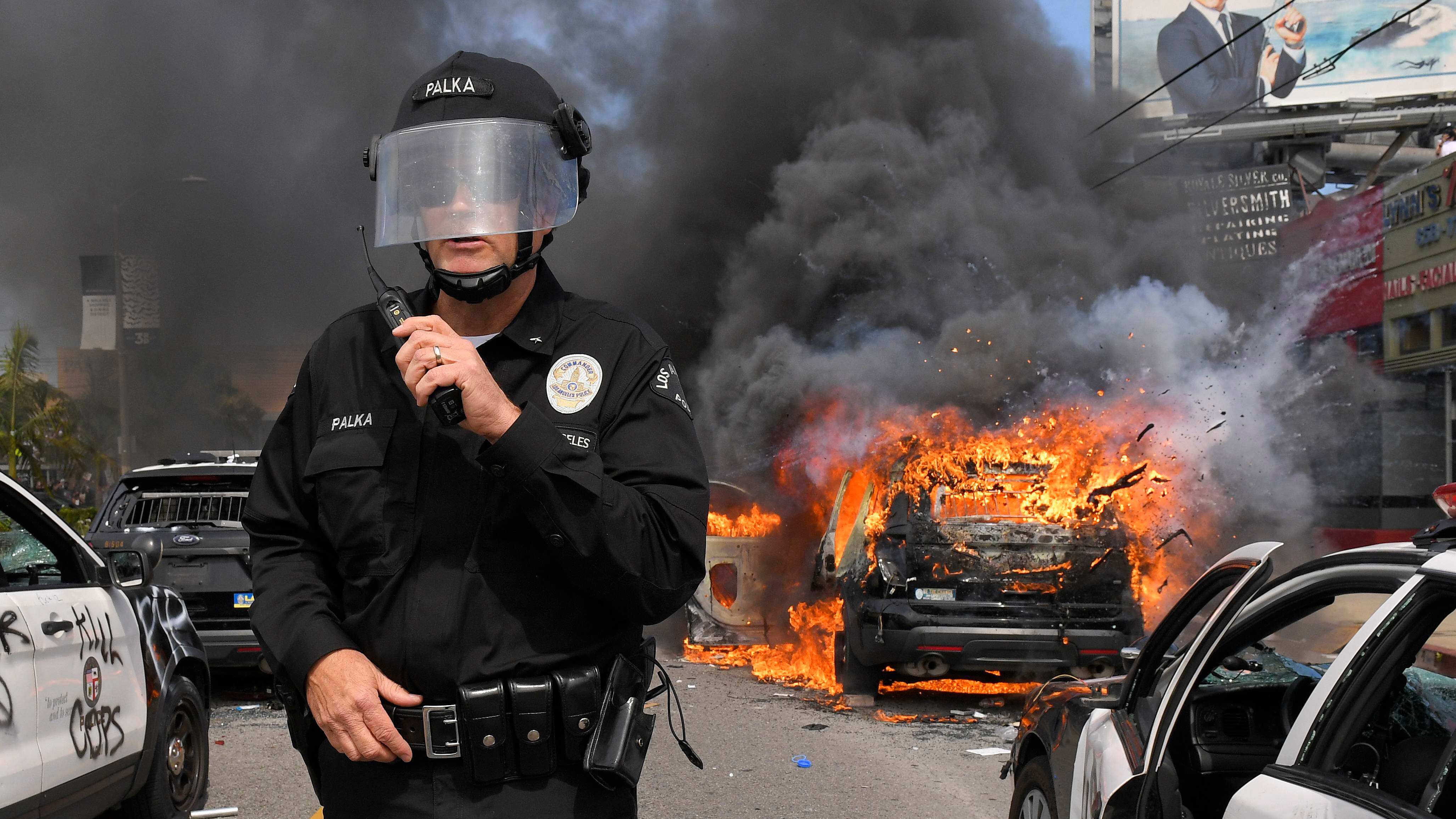 Las cuadrillas de bomberos enfrentaron decenas de incendios, mientras que cientos de negocios sufrieron daños. Una de las áreas más golpeadas fue la que se encuentra en los alrededores de The Grove, un popular y lujoso complejo comercial al aire libre ubicado al oeste del centro de la ciudad y al que cientos de manifestantes irrumpieron arrojando rocas y otros objetos contra los policías y vandalizando tiendas. Un agente sufrió una fractura de cráneo durante los enfrentamientos, informó el jefe de la policía de Los Ángeles, Michel Moore.