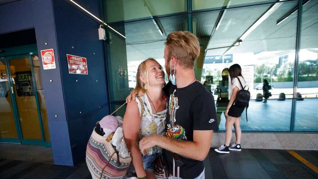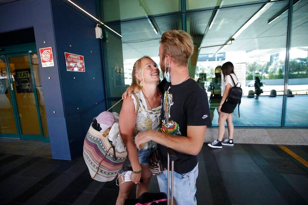 En el Aeropuerto Leonardo da Vinci de Roma, Andrea Monti abrazó efusivamente a su novia Katherina Scherf cuando ésta llegó procedente de Duesseldorf, Alemania.