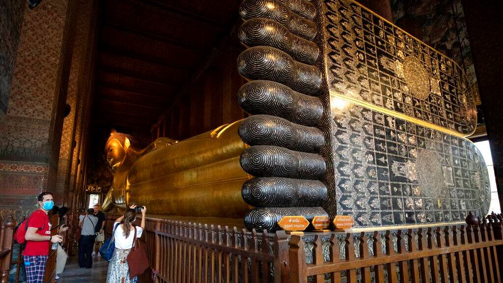 El templo es uno de los más grandes del país, con murales y adornos dorados que cubren muchas superficies, pero es mejor conocido por albergar al Buda Reclinado de 46 metros (151 pies) de largo, que está cubierto de oro.