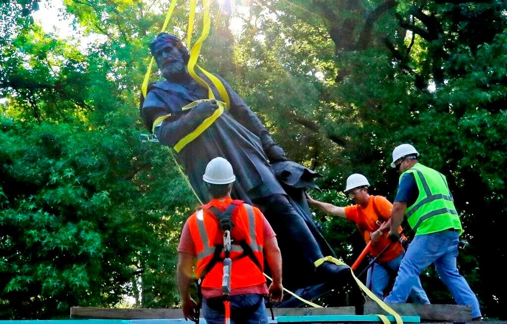 Los comisionados que supervisan el Parque Tower Groove votaron recientemente para retirar la estatua. Fue colocada en un camión, pero no estaba claro su destino final. Funcionarios del parque no respondieron de inmediato a un mensaje telefónico en busca de comentario.