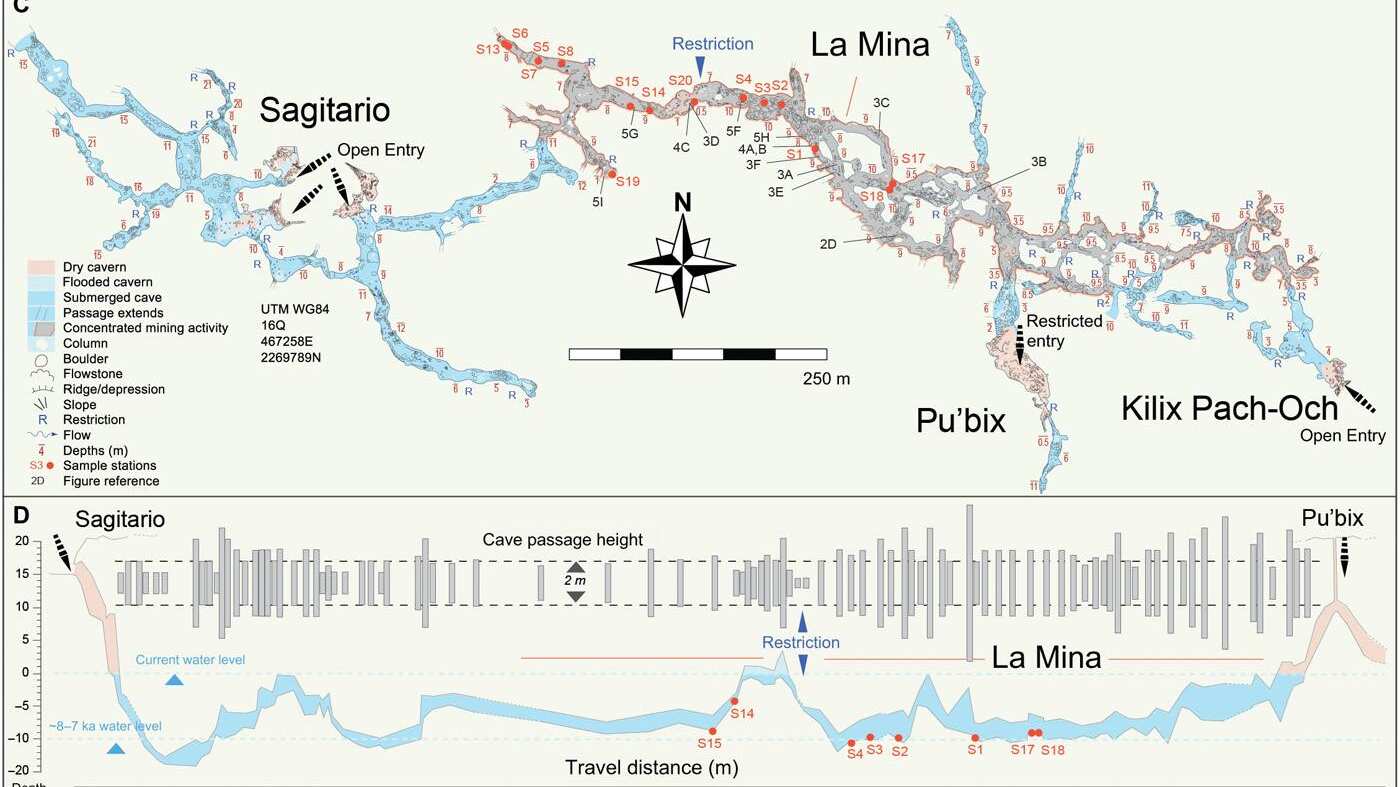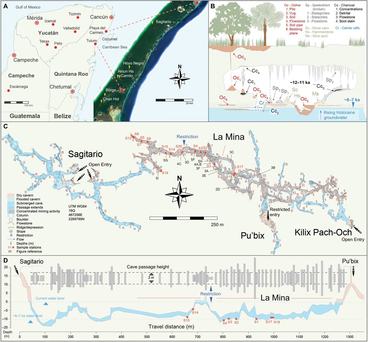La revista científica Science Advance publicó que el descubrimiento es una mina de ocre que se encuentra sumergida en las aguas. Sin embargo, la mina hace miles de años se encontraba en la superficie. Los hallazgos fueron encontrados en las cuevas que simulan un laberinto de túneles de más de 374 kilómetros que salieron a la luz tras más de 100 inmersiones, así como 600 horas de trabajo. En el interín el grupo tomó 20,000 fotos.