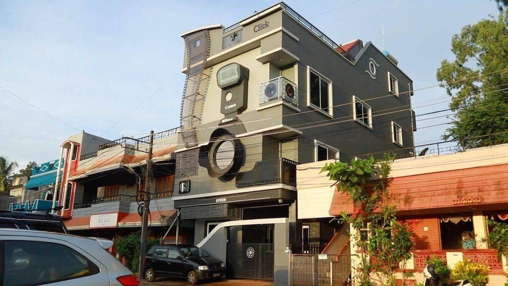 Hongal vive en la India y al ver su casa uno ya puede palmar su amor por la fotografía, y de manera bastante directa, pues su casa tiene forma de una cámara de fotografía. En este hogar bien particular vive con su esposa y sus tres hijos, cuyo nombres también nos dan una señal clara de la posición de su padre: los niños se llaman Nikon, Epson y Canon.