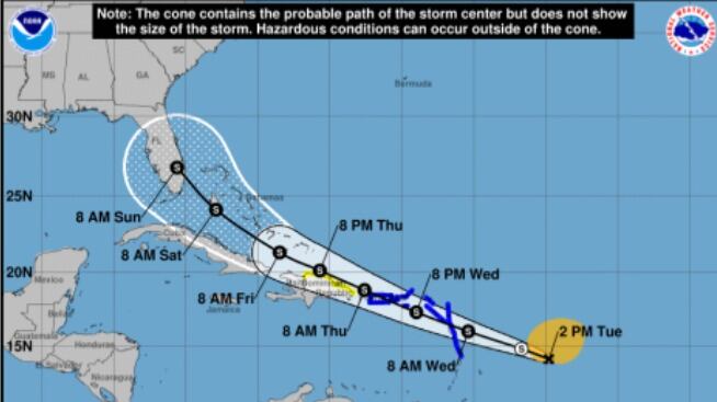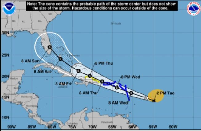 En estos momentos se encuentra en la latitud 14.1 norte, longitud 54.8 oeste a unas 510 millas de las Islas de Sotavento. Tiene vientos de 40 millas por hora.