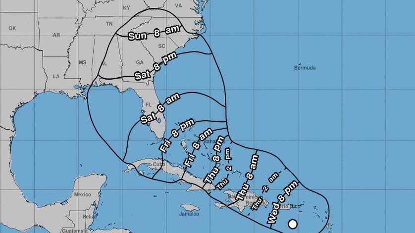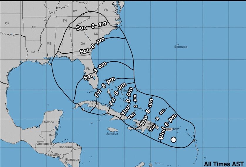 En la ruta pronosticada, el sistema continuará pasando al sur de Puerto Rico esta noche, cerca o sobre La Española el jueves, cerca del este de Cuba y el sureste de Bahamas el viernes, y se acercan al el noroeste de Bahamas y el sur de Florida el viernes por la noche.