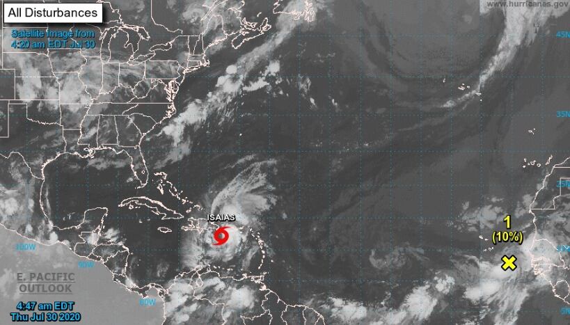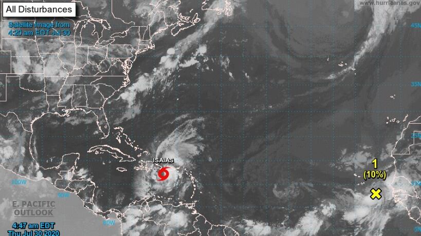A eso de las 5:00 de la madrugada la tormenta tropical Isaías se encontraba cerca de la latitud 17.2 grados norte con la longitud 67.9 grados oeste, a unas 100 millas al oeste suroeste de Ponce y cerca de 160 millas al sureste de Santo Domingo.