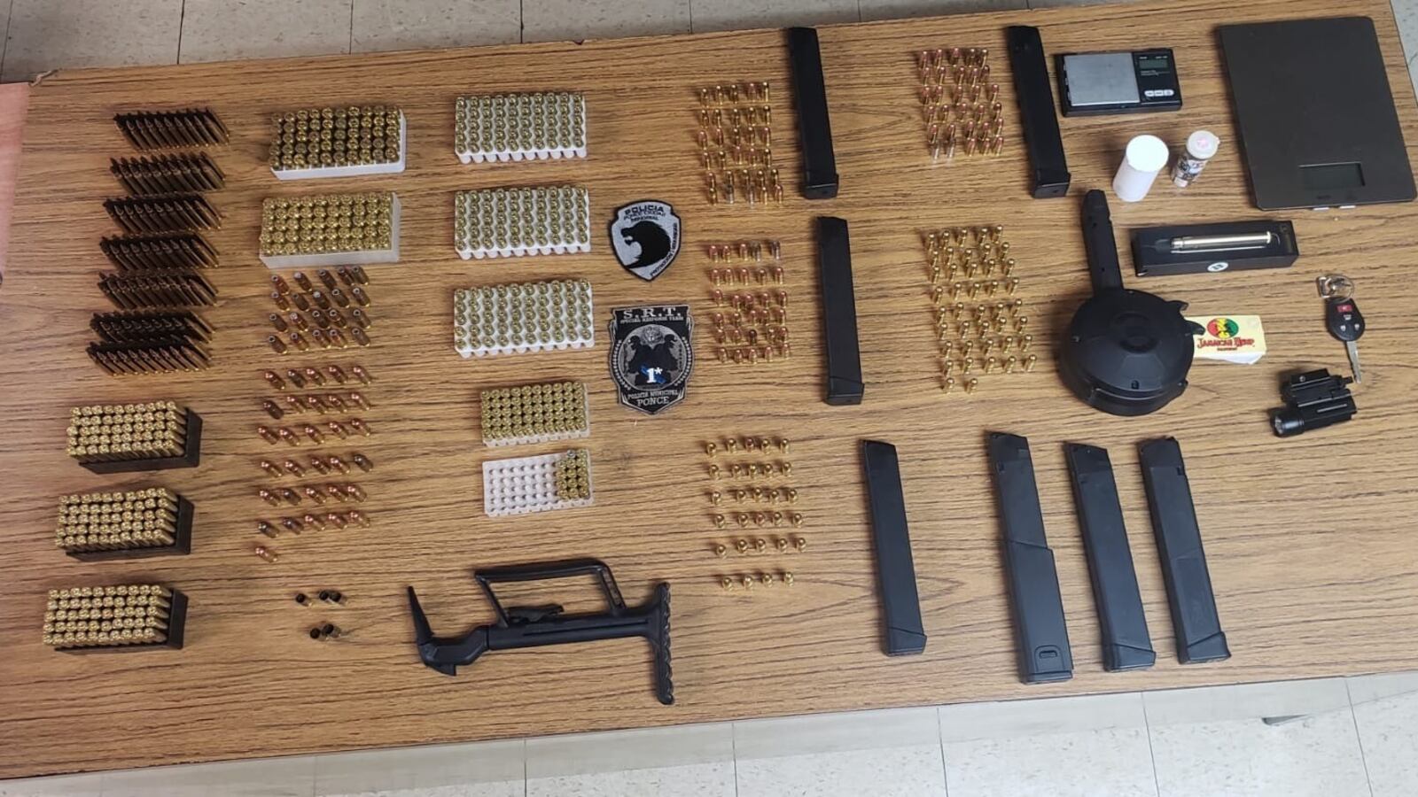 Mientras ejecutaban la investigación sobre la querella de violencia doméstica, la policía ocupó tres bultos que contenían 5 cargadores, 70 municiones calibre 223, 150 calibre 556, 151 calibre .45 y 375 calibre 9mm.