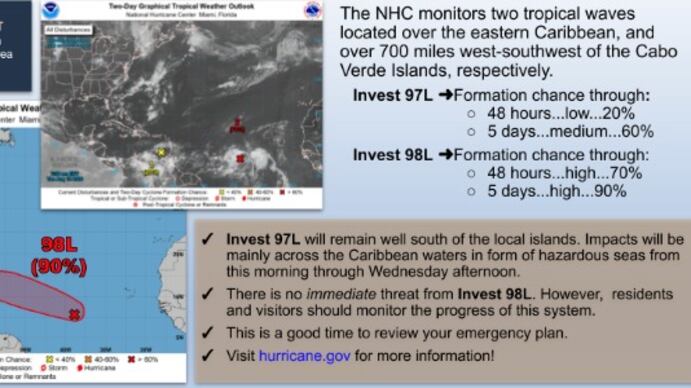 Mientras, el Invest 98L tiene 70 por ciento de formación en las siguientes 48 horas y en los próximos 5 días; 90 por ciento.