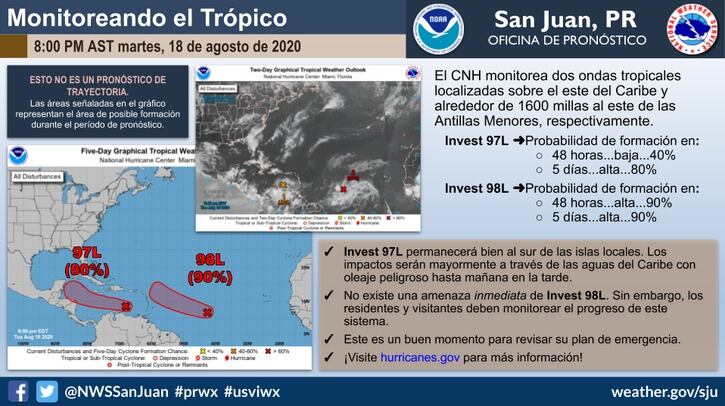 En su informe de esta noche, la Oficina de Pronóstico en San Juan del Centro Nacional de Huracanes (CNH) elevó a 90% la posibilidad de formación del invest 98L, una de dos ondas tropicales que evalúan por posible impacto en el Caribe.