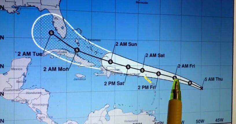 “Como tormenta tropical, entonces, continuará el paso al oeste-noroeste pasando bien cerca al norte de las Antillas Menores, bien cerquita de las Islas Vírgenes, cerca al norte de Puerto Rico y cerca al norte de República Dominicana”, dijo un empleado de la central a través de un video colgado en Facebook.