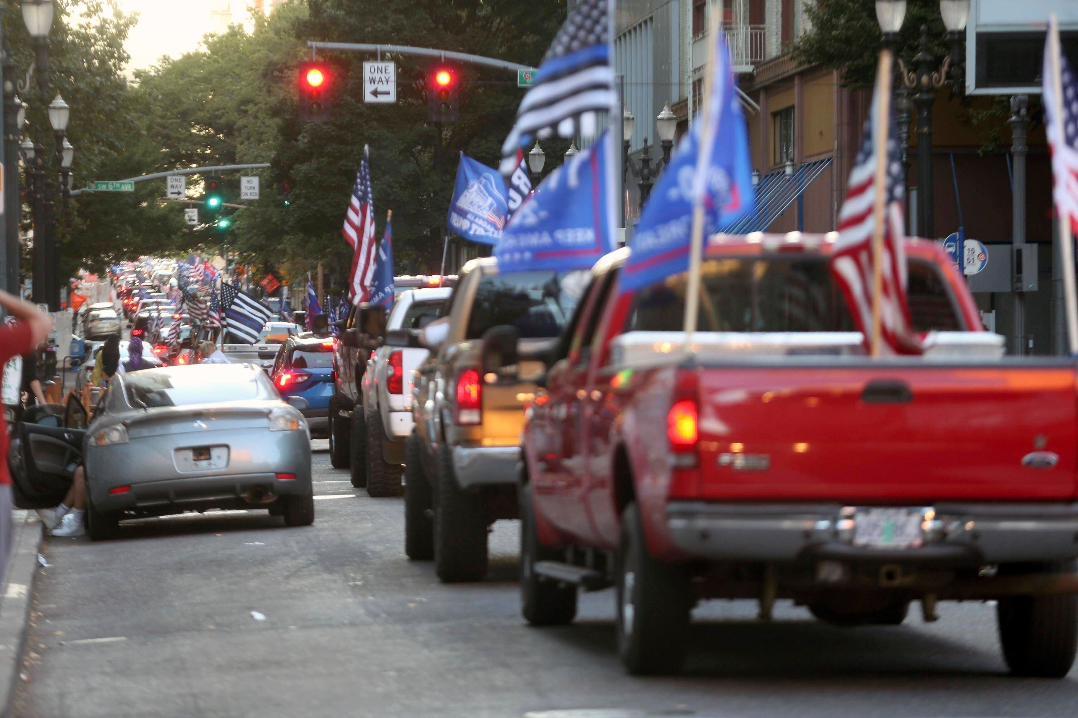 La caravana se dirigió al centro de la ciudad más grande de Oregon después de realizar un mitin durante el día en el estacionamiento del centro comercial Clackamas Town Center. Muchos de los participantes ondeaban banderas de Trump.