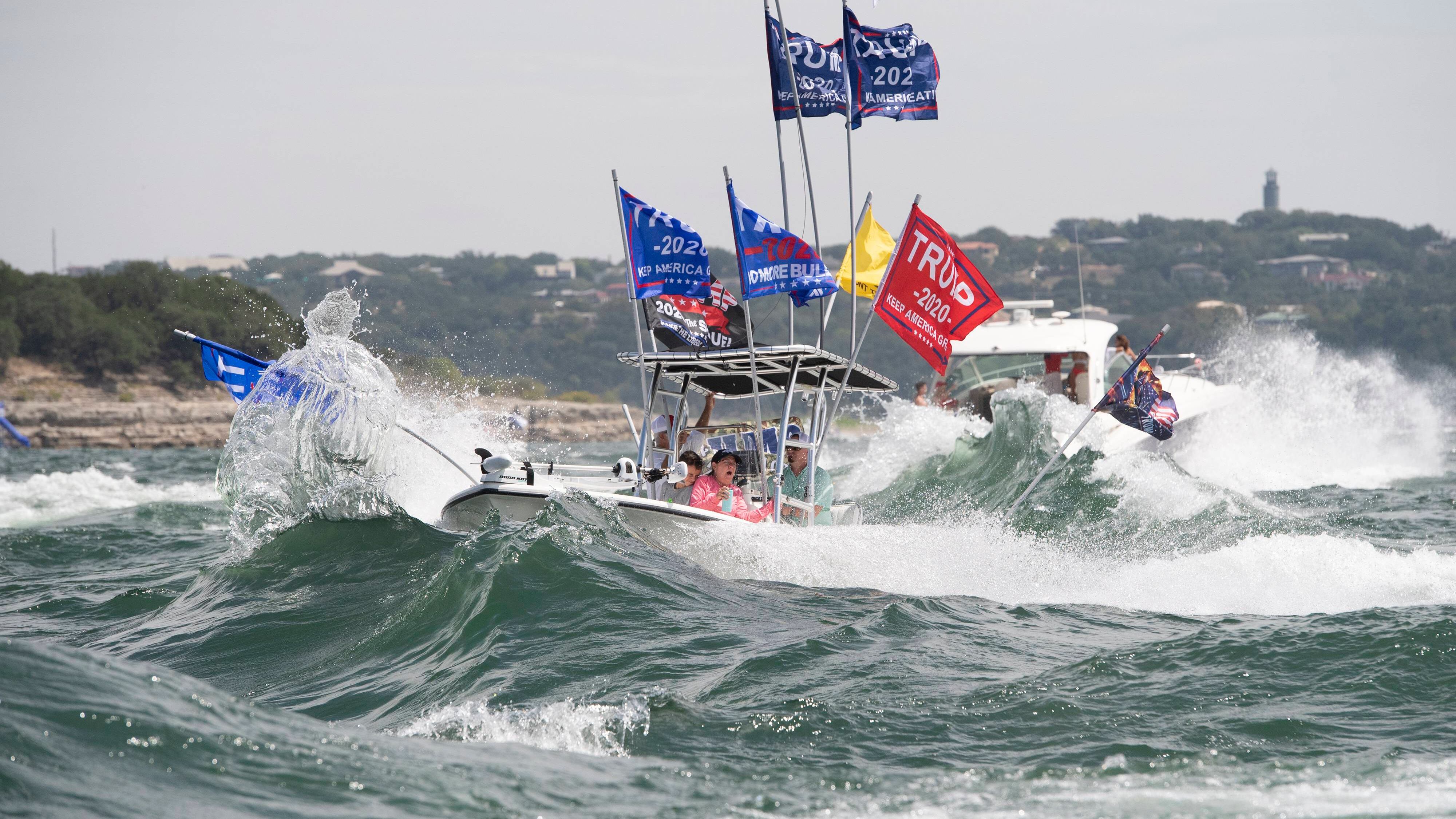En imágenes del evento se ve el agua agitada del lago Travis con decenas de barcos ondeando banderas de Estados Unidos, Texas y “Trump 2020”.