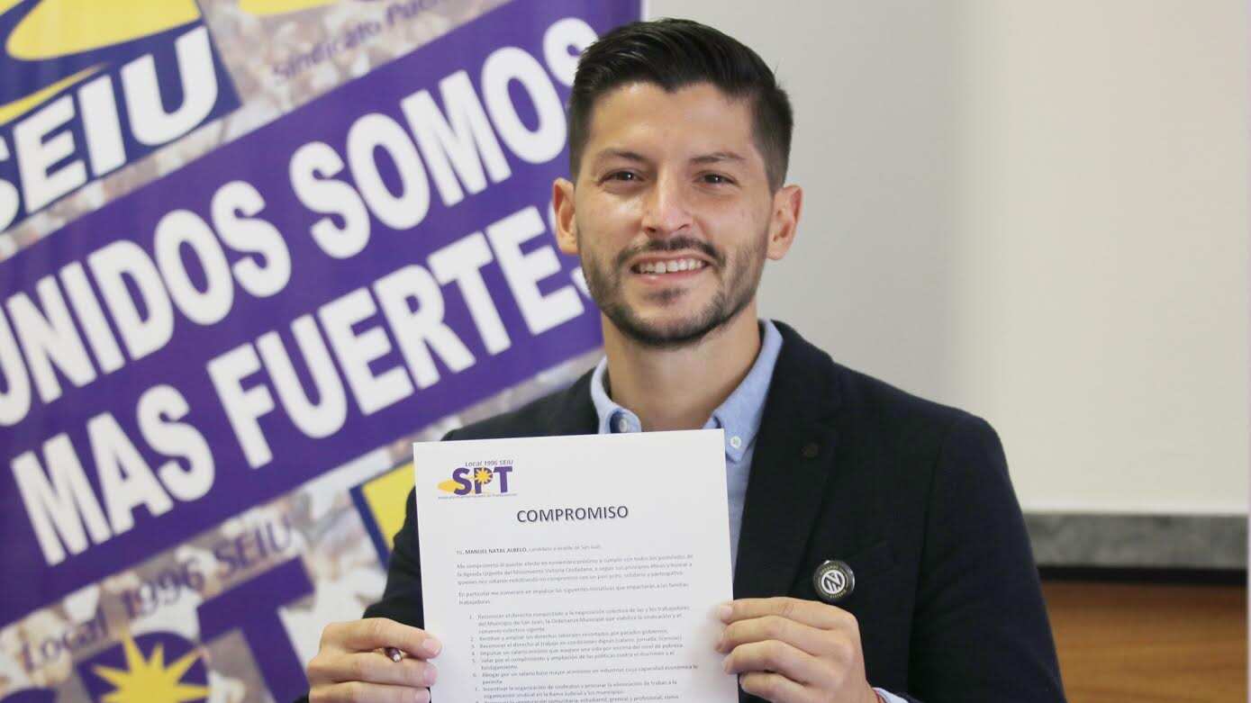 El candidato a la alcaldía de San Juan por el Movimiento Victoria Ciudadana (MVC), Manuel Natal Albelo, suscribió un compromiso escrito por el Sindicato Puertorriqueño de Trabajadores y Trabajadoras (SPT), en el cual se compromete a defender los derechos de los trabajadores y trabajadoras en el municipio de la capital.