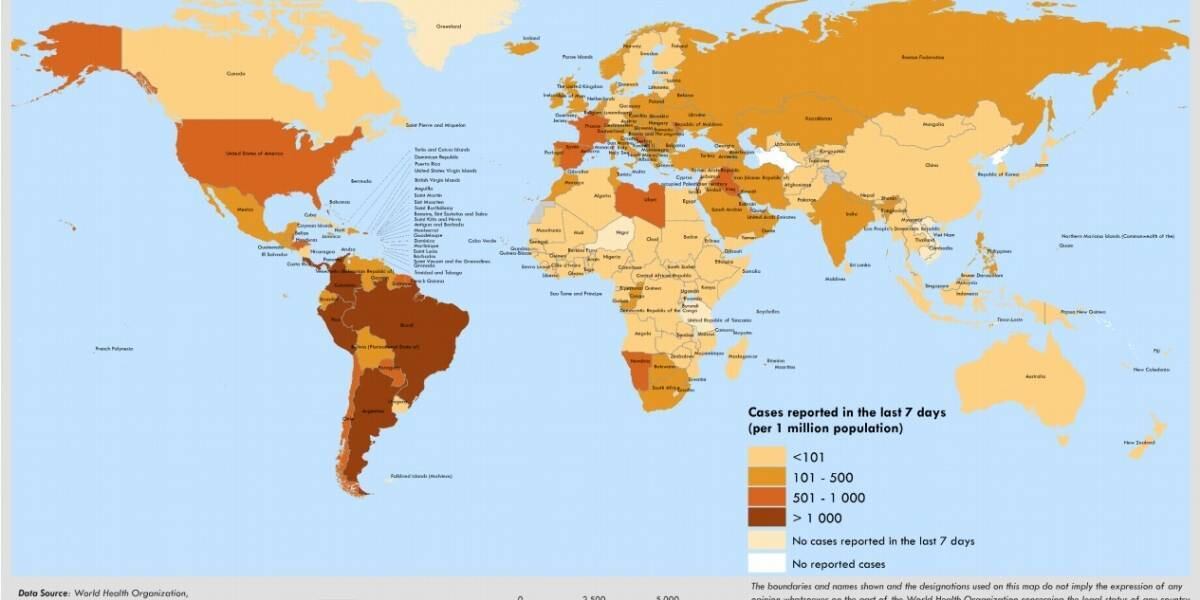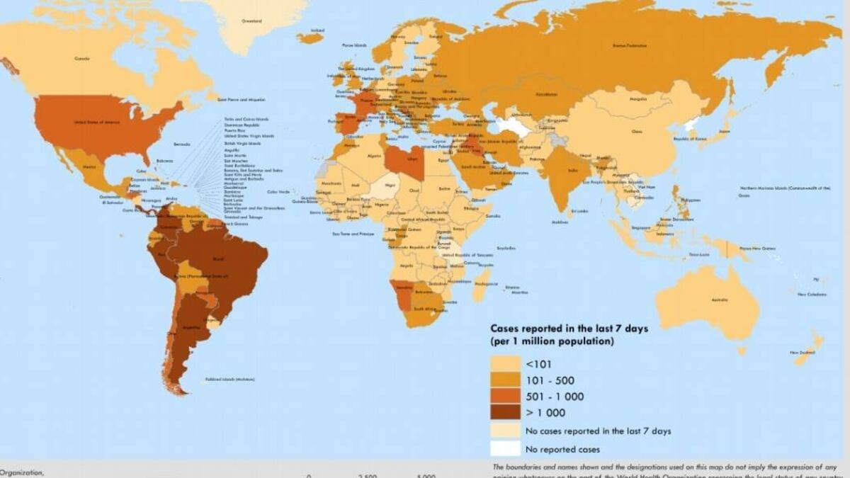 Un mapa de la Organización Mundial de la Salud (OMS) muestra como América Latina continúa siendo la región más afectada por la pandemia del COVID-19.