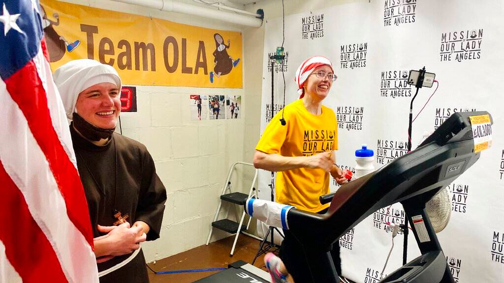 Por eso, la corrida del 23 de agosto fue transmitida en vivo vía Zoom y difundida por YouTube. Ese día, la monja de 32 años se colocó en la cabeza una banda con la bandera de Estados Unidos y corrió junto a estatuas de San Francisco de Asís y de la Virgen María.