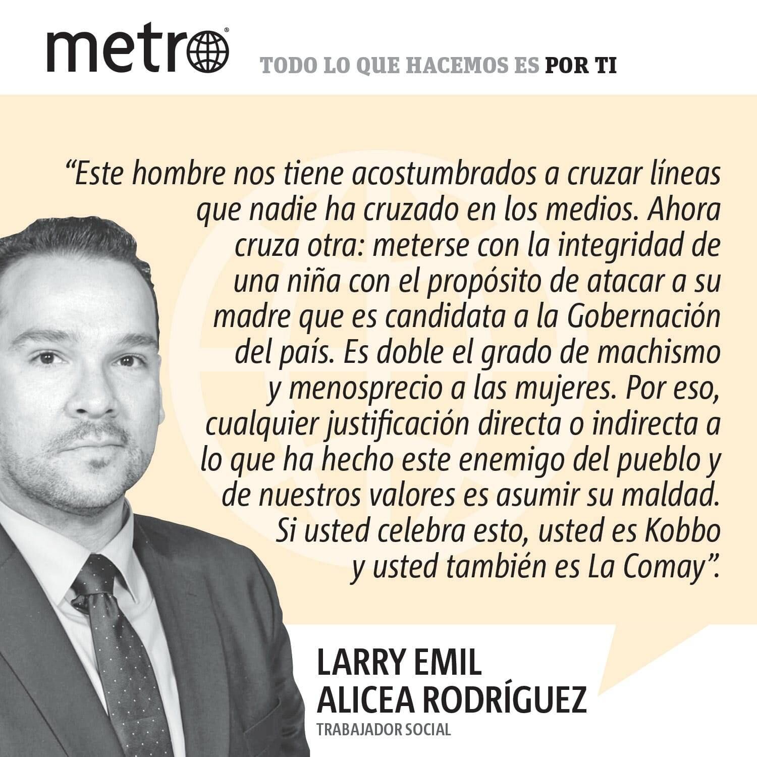 Este hombre nos tiene acostumbrados a cruzar líneas que nadie ha cruzado en los medios. Ahora cruza otra: meterse con la integridad de una niña con el propósito de atacar a su madre que es candidata a la Gobernación del país. Es doble el grado de machismo y menosprecio a las mujeres. Por eso, cualquier justificación directa o indirecta a lo que ha hecho este enemigo del pueblo y de nuestros valores es asumir su maldad. Si usted celebra esto, usted es Kobbo y usted también es La Comay.