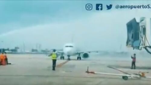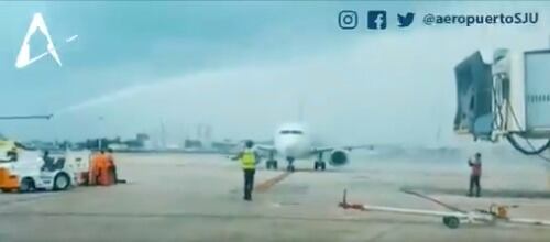 Personal del Aeropuerto Internacional Luis Muñoz Marín recibieron con un icónico arco de agua al primer vuelo de Copa Airlines que llega a Puerto Rico desde hace más de seis meses.