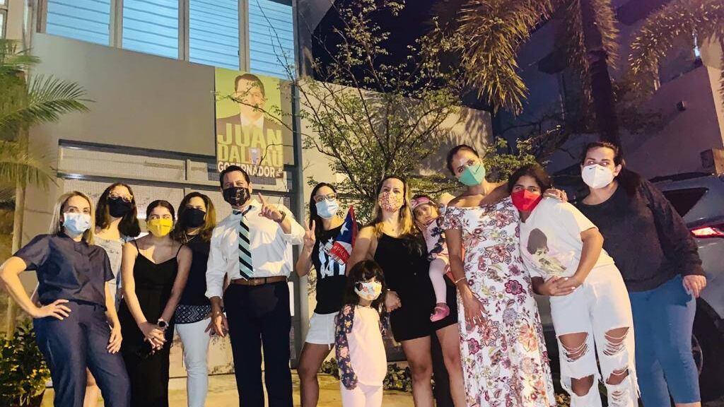 El candidato a la gobernación por el Partido Independentista Puertorriqueño (PIP), Juan Dalmau, pasó hoy por la urbanización Senderos de Montehiedra para visitar a la residente que había sido amenazada de multa por colgar letreros a favor del candidato en su casa.