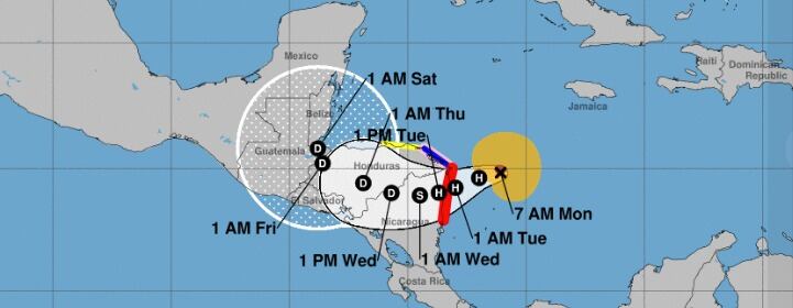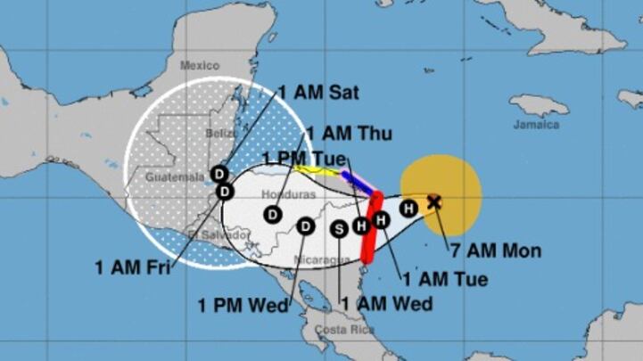 El lunes por la mañana, el ciclón tenía vientos máximos sostenidos de 150 kilómetros (90 millas) por hora y se encontraba unos 225 km (140 millas) al este de la frontera entre Nicaragua y Honduras, según el Centro Nacional de Huracanes de Estados Unidos. Avanzaba hacia el oeste a 17 kilómetros (10 millas) por hora.