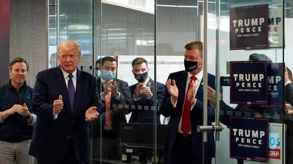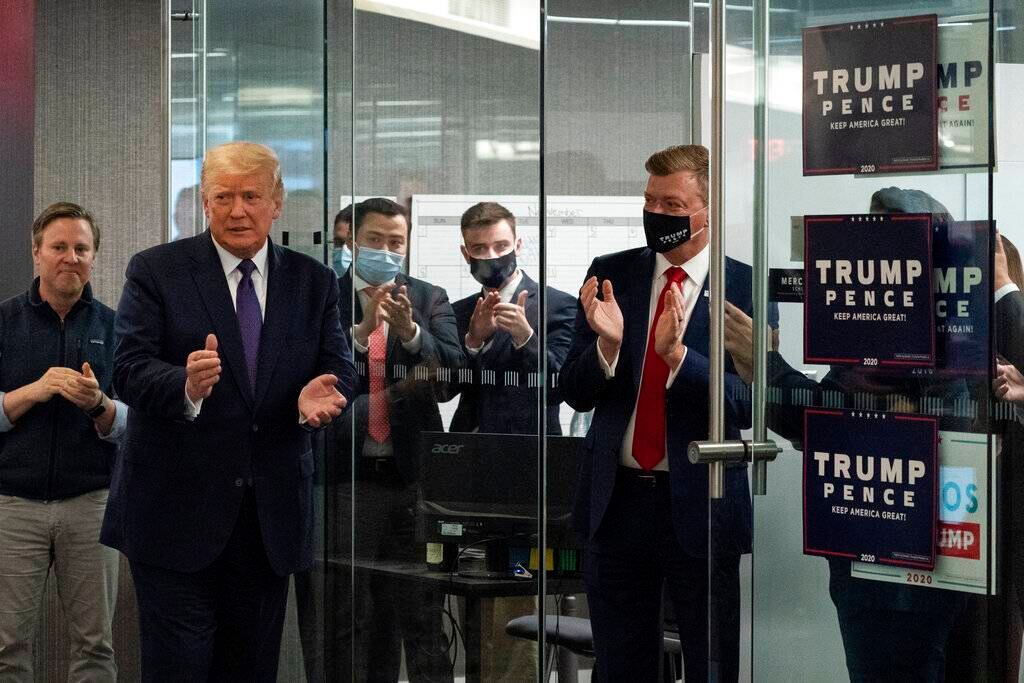 Partidarios vitorearon y aplaudieron al presidente Donald Trump en la sede de su campaña, donde estuvo de visita el martes para agradecer a decenas de colaboradores.