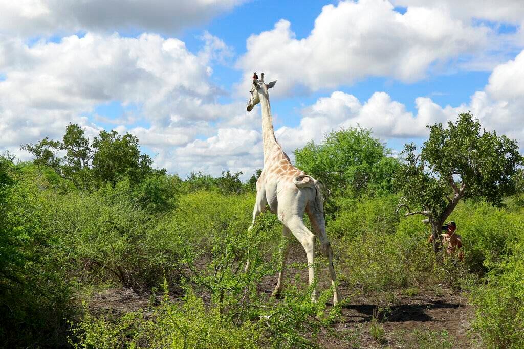 Un raro rasgo genético llamado leucismo le causa el color blanco y hace que el animal destaque en la árida sabana próxima a la frontera con Somalia.