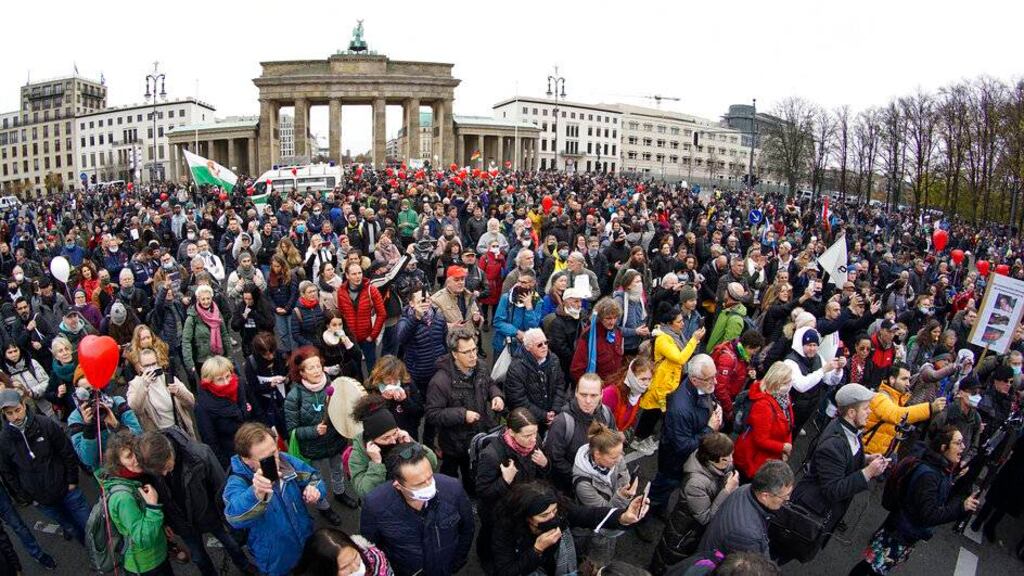 Los manifestantes se congregaron ante la emblemática Puerta de Brandeburgo, así como en calles y puentes. Como la mayoría de las protestas contra las restricciones por el coronavirus, el acto reunió a personas diversas, de la ultraizquierda a la ultraderecha, así como familias, estudiantes y otros.
