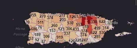 El municipio con más casos es la capital, San Juan, que ha notificado un total de 8,410 casos; a lo que le sigue Bayamón con 3,963.