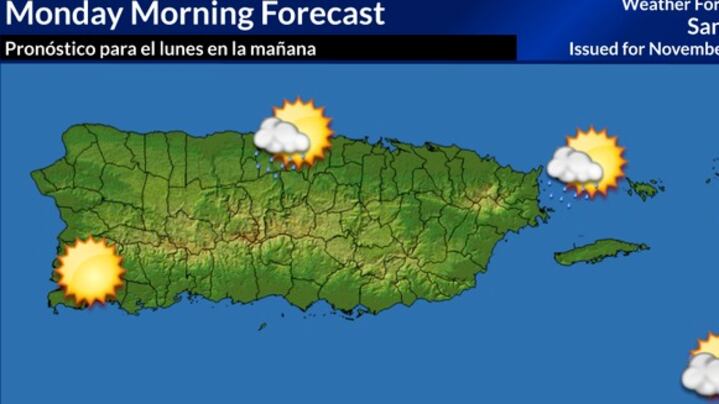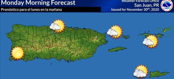Para la mañana del lunes se esperan condiciones de tiempo tranquilas, con algunos aguaceros pasajeros que pudieran afectar sectores del norte de Puerto Rico y las Islas Vírgenes Estadounidenses, informó el Servicio Nacional de Meteorología (SNM) en San Juan.