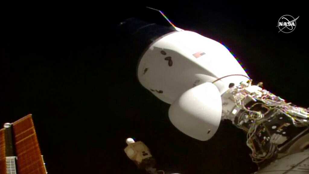 La tripulación supervisó todas las acciones mientras la cápsula se acercaba a la estación y se acoplaba a más de 420 kilómetros (260 millas) sobre el océano Índico. Los dos sitos disponibles para las cápsulas Dragon están a unos 4.5 metros (15 pies) de distancia entre sí.