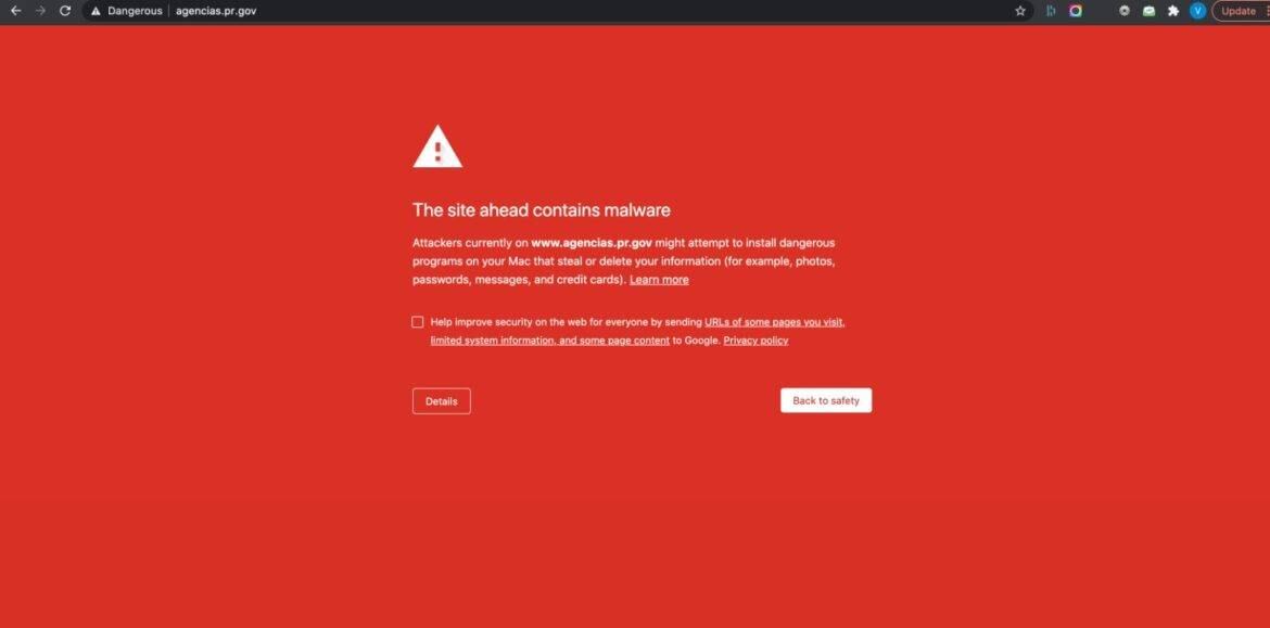 “Como parte de sus criterios automáticos, Google determinó que unos enlaces colocados en la página web del Departamento de Desarrollo Económico (DDEC), por parte de su agencia de publicidad, pudieran ser de carácter malicioso. A raíz de ello, Google levantó una bandera de seguridad automática que se extendió a las páginas de otras agencias bajo el dominio pr.gov”, dijo Glorimar Ripoll Balet, la principal ejecutiva de PRITS al Centro de Periodismo Investigativo (CPI) en declaraciones escritas.