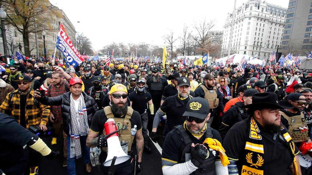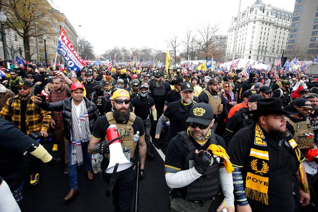 Pero si bien las marchas del sábado, incluido una en la céntrica plaza Freedom, eran más peequeñas que las del 14 de noviembre, reunieron a un contingente mayor de los Proud Boys, un grupo neofascista conocido por incitar a la violencia callejera. Algunos llevaban chalecos antibalas mientras avanzaban por la ciudad.