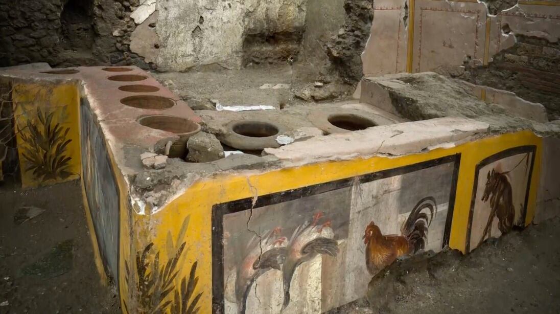 Arqueólogos italianos presentaron un termopolio, el equivalente de la era romana a un puesto de comida rápida, descubierto en Pompeya y excepcionalmente bien conservado, como muestran las imágenes publicadas el sábado.