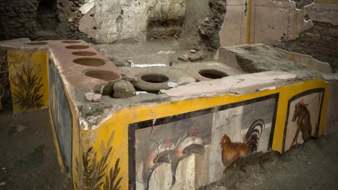 Los científicos encontraron el termopolio en el área de excavaciones de Regio V en 2019. Otros trabajos descubrieron sus representaciones de naturaleza muerta, que incluyen a Nereida montando un caballito de mar, gladiadores, un perro y un gallo.