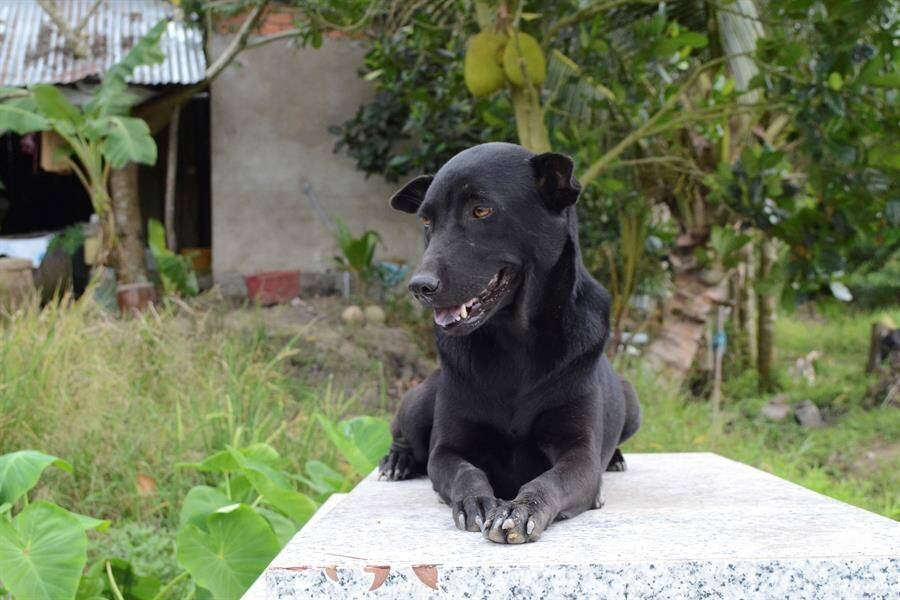 El pelaje negro azabache de Mino clarea en la parte trasera del lomo, donde adquiere tonos de un marrón descolorido, algo que la familia atribuye a las largas horas pasadas bajo el sol y la lluvia sobre la tumba del niño fallecido en la provincia de Long An, en el delta del río Mekong.