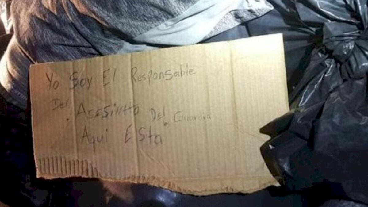 El mensaje escrito colocado junto al cadáver lee así: “yo soy el responsable del asesinato del guardia… Aquí está”.