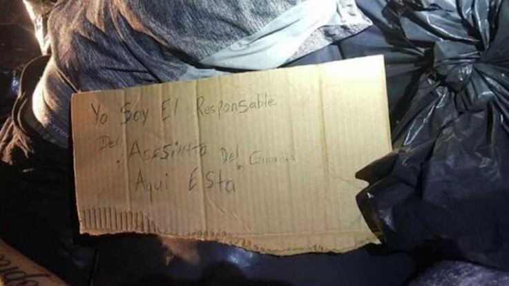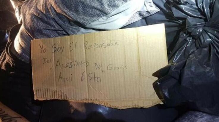 Según información, el mensaje escrito colocado junto al cadáver lee así: “yo soy el responsable del asesinato del guardia… Aquí está”.