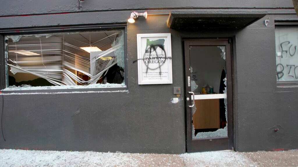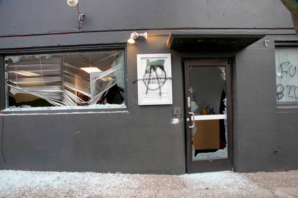 La policía informó que el grupo destrozó las ventanas y pintó con aerosol símbolos anarquistas en el edificio del partido político. Fue uno de por lo menos cuatro grupos que planeaban reunirse en la ciudad el día de la investidura de Biden.