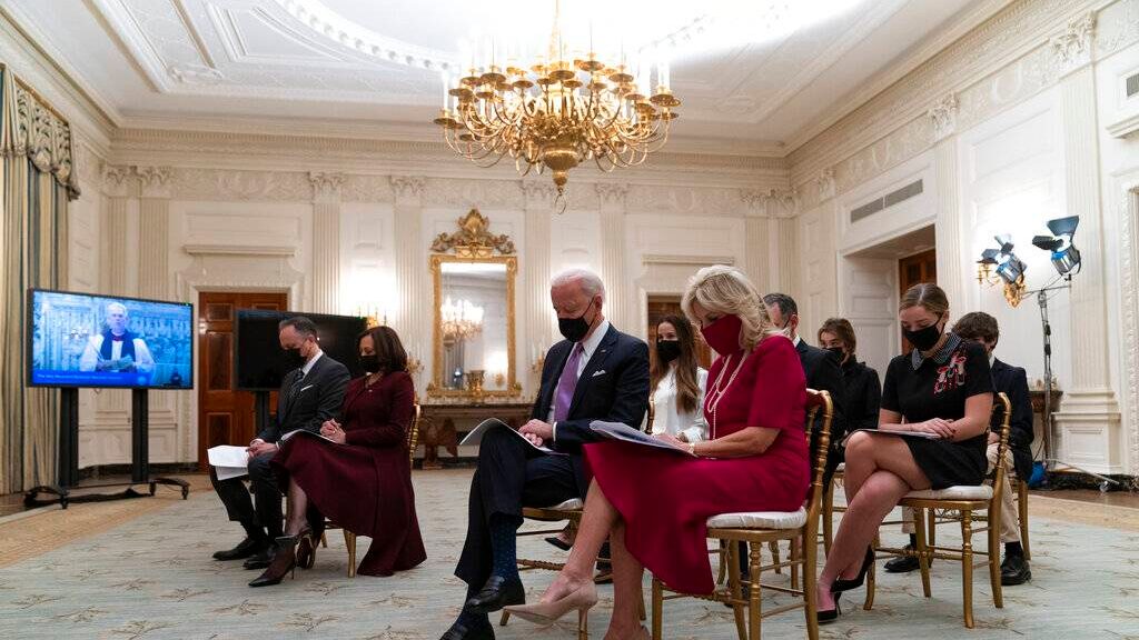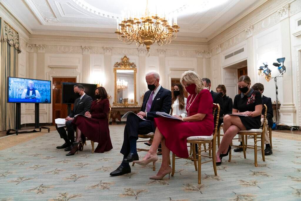 Cuando Biden tomó juramento a cientos de empleados el miércoles, la ceremonia fue virtual: el presidente veía a los miembros de su equipo en pantallas de video.