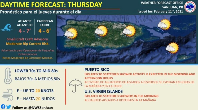 Para este jueves en la mañana se esperan lluvias aisladas o dispersas en el este y norte de Puerto Rico, seguido en la tarde de chubascos sobre partes del interior y oeste de la Isla, informó la oficina en San Juan del Servicio Nacional de Meteorología (SNM).