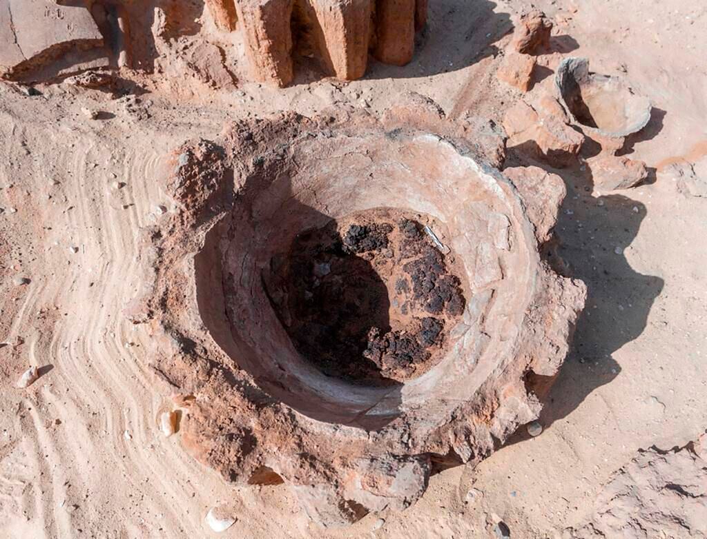 Los arqueólogos hallaron ocho enormes unidades, cada una de unos 20 metros de largo y 2,5 metros de ancho (65 pies de largo y 8 pies de ancho), en dos filas. Cada una contiene unos 40 barriles de cerámica en los que se calentaban los granos y el agua para producir cerveza, expresó Waziri.